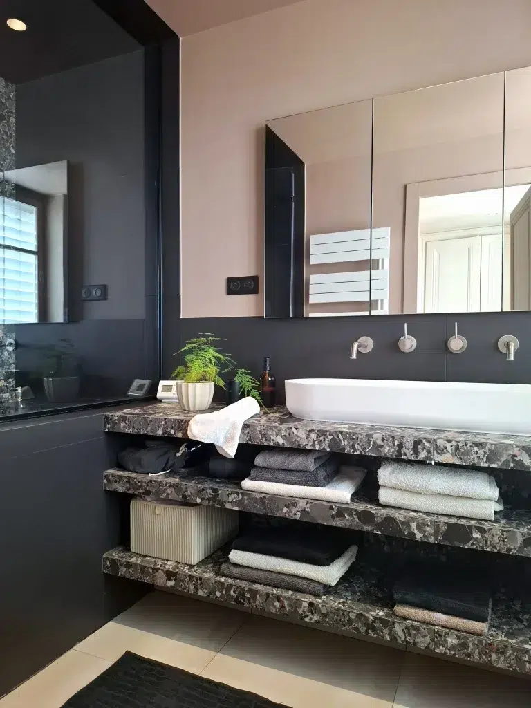 Le contraste du noir graphique, l’aspect minéral du carrelage et les lignes minimalistes apportent un équilibre subtil entre douceur et caractère.